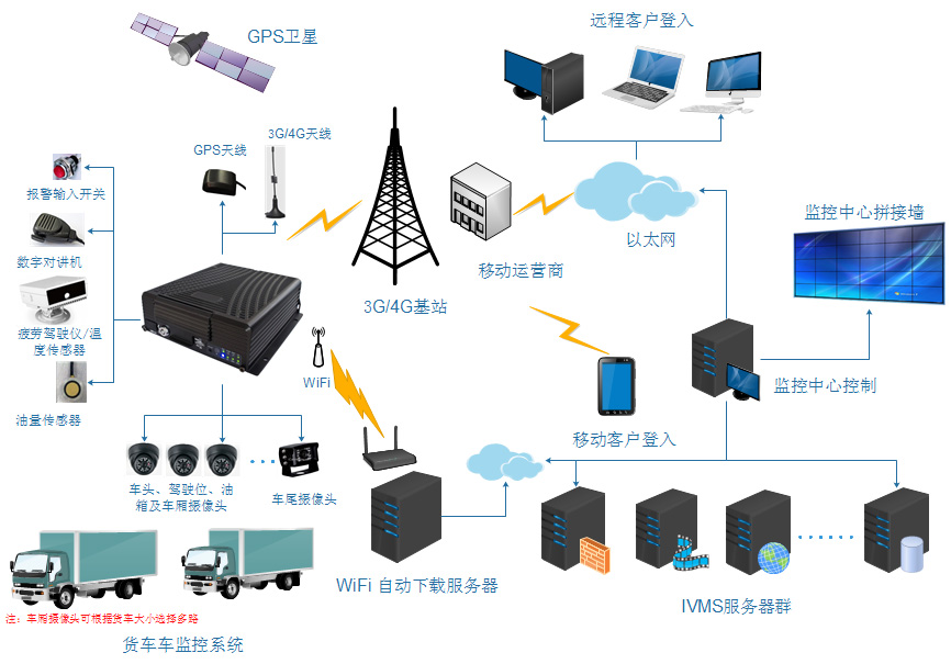 系统通过MDVR主机完成对音视频、GPS、报警数据进行编码、存储。并通过3G/4G移动网络完成音视频、报警信息、GPS数据的上传;同时实现设备远程升级、参数修改、数字对讲、远程抓拍等远程管理操作。